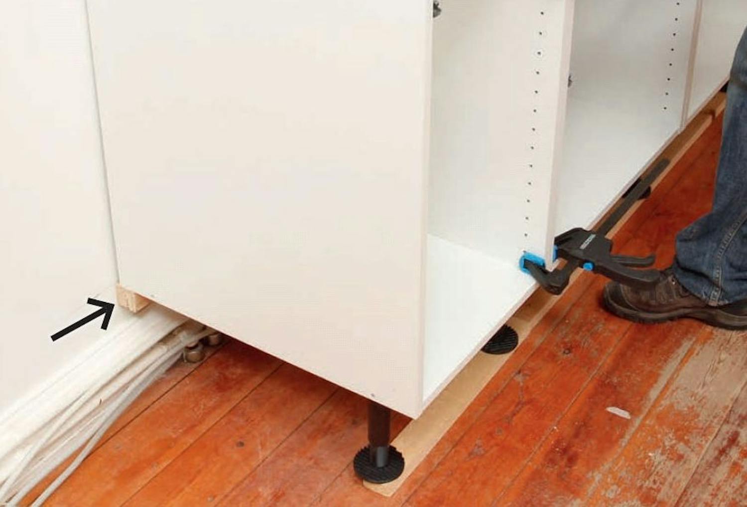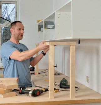 Bygg ett enkelt monteringsstöd bestående av en platta och fyra ben. Benen ska ha en sådan längd att överskåpen kommer att sitta på rätt höjd med skåpen ovanpå monteringsstödet. När skåpen har placerats på stödet trycker du det försiktigt på plats upp mot väggen och sätter ihop skåpen med monteringsskruvar.