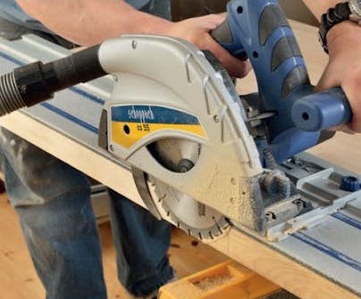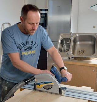Såga till bänkskivan med en cirkelsåg med styrskena. Den sista biten av den rundade kanten tas bort med fogsvans och stämjärn så att du får ett knivskarpt hack där stödskivan passar in.
