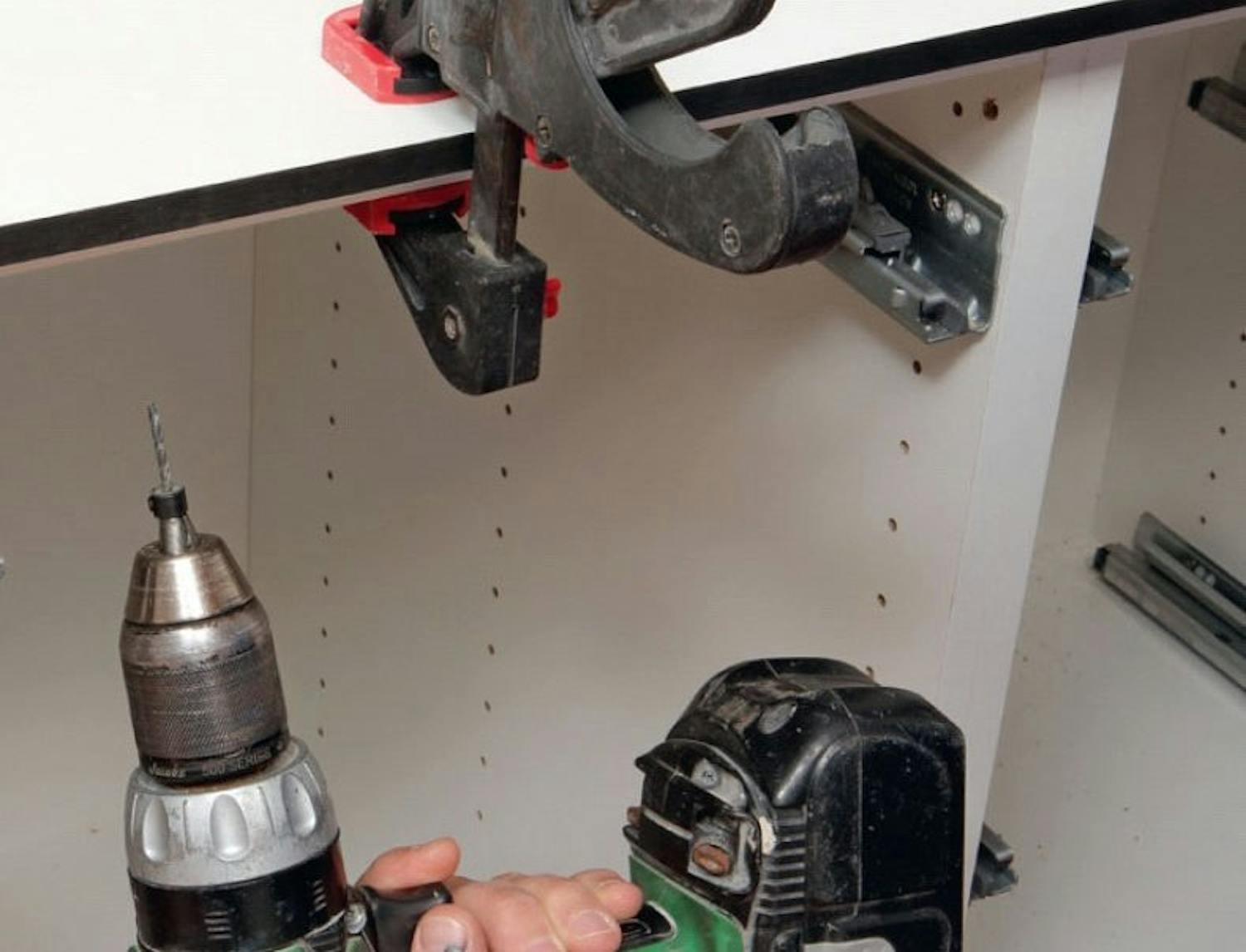 Bygg en mall av en bit vinkelrät träskiva med lister på två av sidorna. Mät ut var handtaget ska placeras så att det sitter mitt på luckan/ lådan, och mät också ut hur långt från överkanten det ska sitta. Borra därefter hål i motsvarande mall.