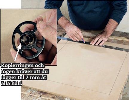 Först ska vi tillverka en ny mall, och den ska konstrueras så att falsens bredd blir 21 mm. Hålet i bänkskivan blir då 55,7 x 49,2 cm.