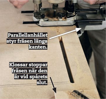 Ställ fräsen på mallen och lägg en liten skivbit av 12 mm mdf under sulan på fräsen, så att den står plant och vågrätt. Pressa ner fräsen tills notfräsen stöter emot bänkskivan. Ställ in och lås fräsdjupet på 11 mm. Ta bort skivbiten.