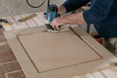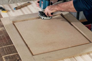 Första och andra fräsningen görs med samma mall. Vår mall är en 12 mm mdf-skiva på 70 x 80 cm, för att vi ska ha en bred kant kvar när hålet har gjorts.