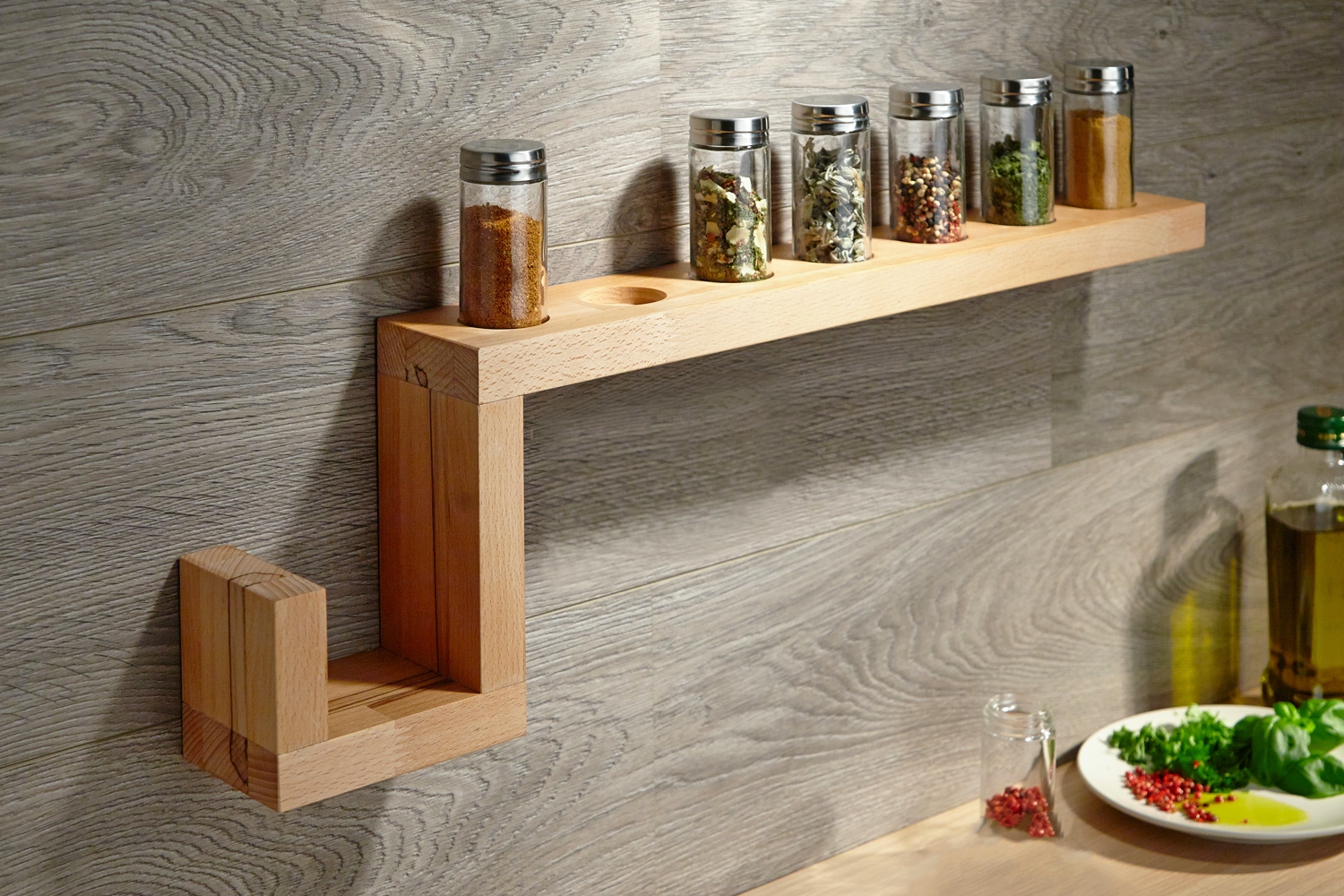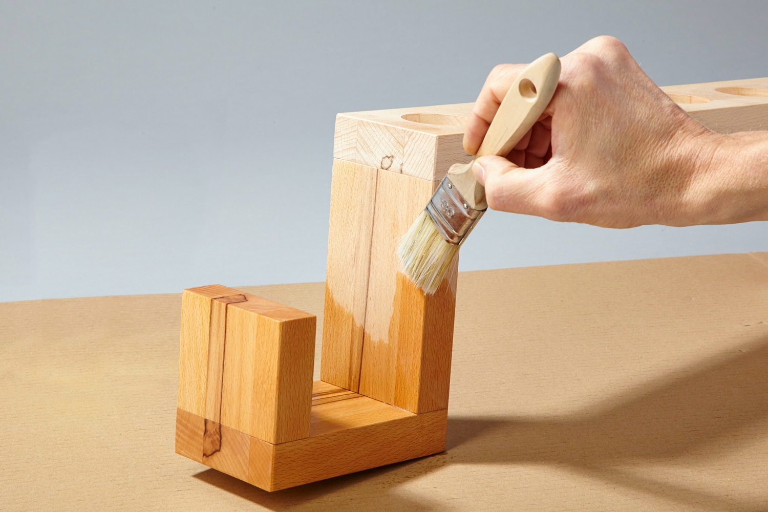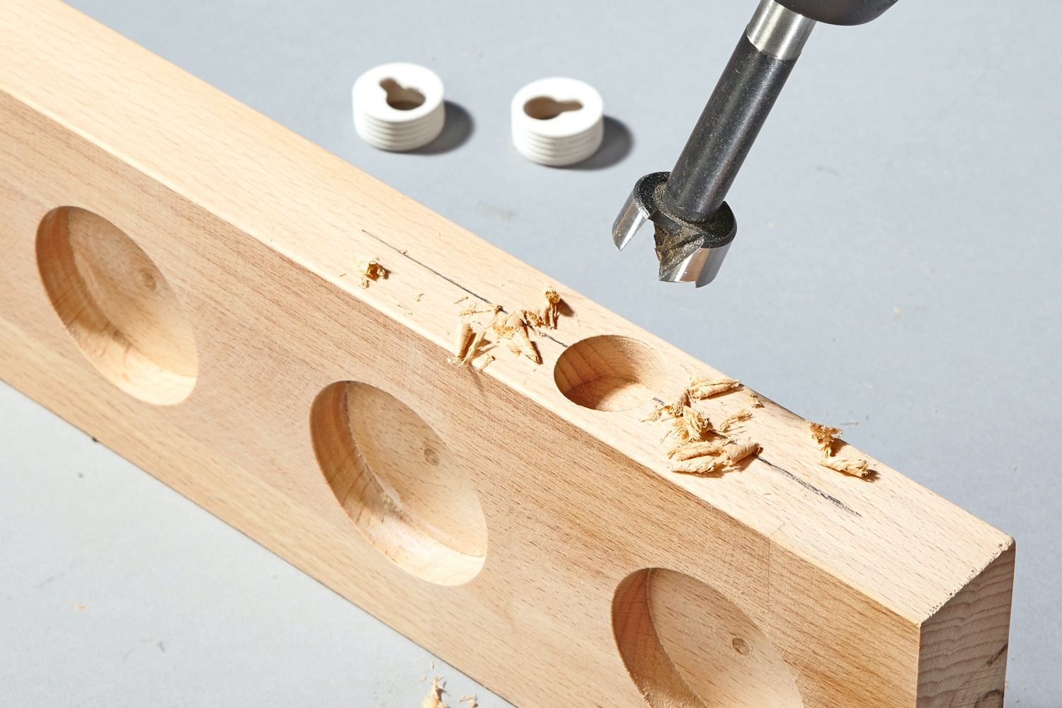 3. Borra ut hål för burkarna med ett forstnerborr. Hålen ska vara 2 mm bredare än burkarna och minst 2 mm djupa.