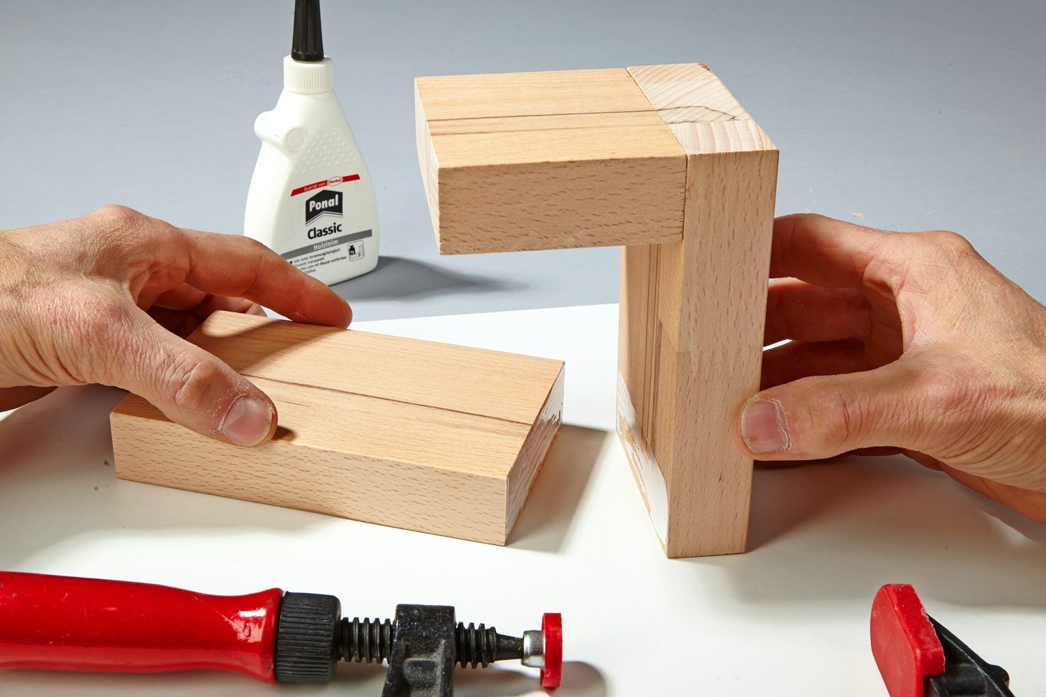 6. Limma ihop delarna. Den bit av bordsskivan som finns kvar är så tjock att den håller enbart med lim.