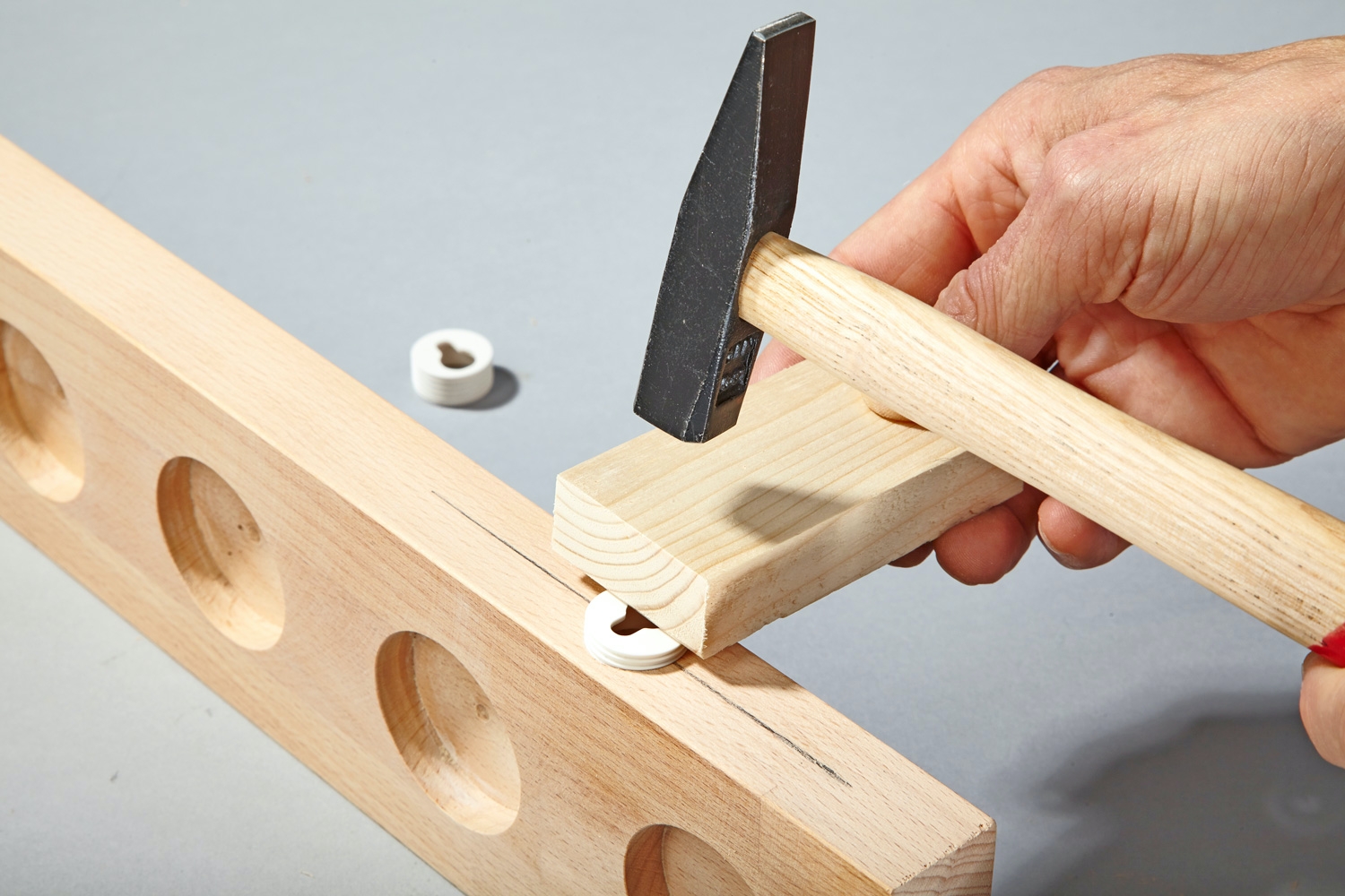 5. Upphängningsbeslagen slås i med en hammare och en slagkloss emellan. Se till att vända beslaget rätt på en gång, eftersom det kan vara svårt att få ut igen.