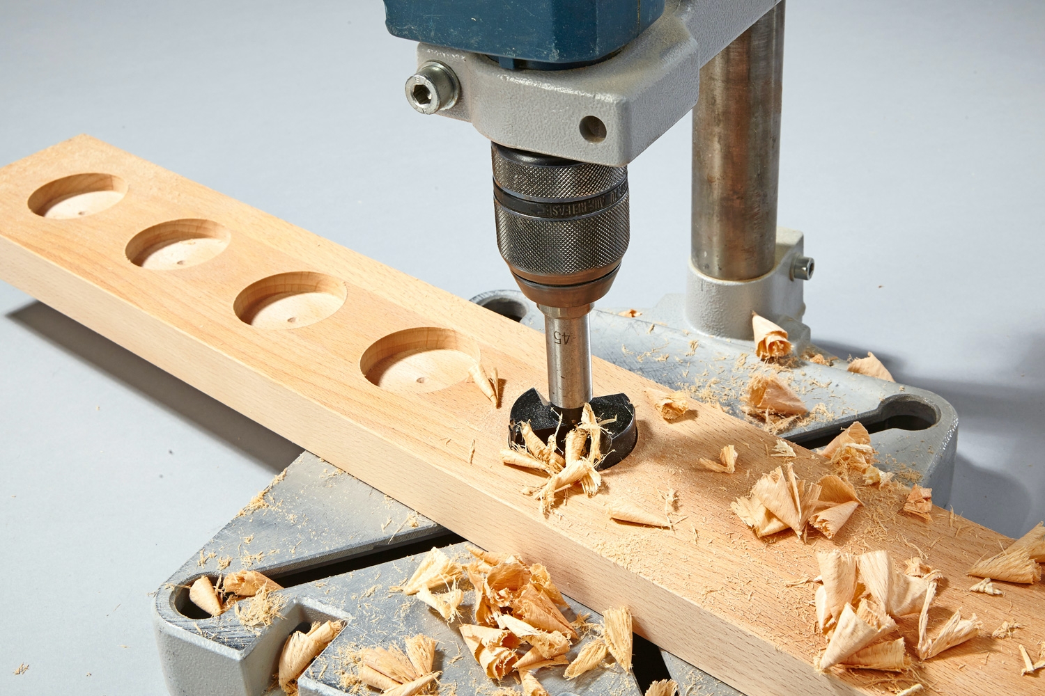 Var mycket noggrann med att borra rakt och se till att alla hål blir lika djupa. Detta görs enklast med en pelarborrmaskin/borrmaskin i ett borrstativ, men det går också bra att använda en vanlig borrmaskin.