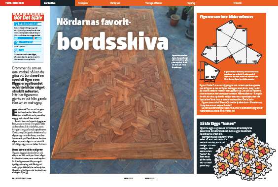 En figur görs i en 3D-printer, som används som mall för att göra alla figurerna till bordsskivan. Mallen tejpas fast på skivan, så att den ligger kvar medan figuren fräses ut med en kantfräs.