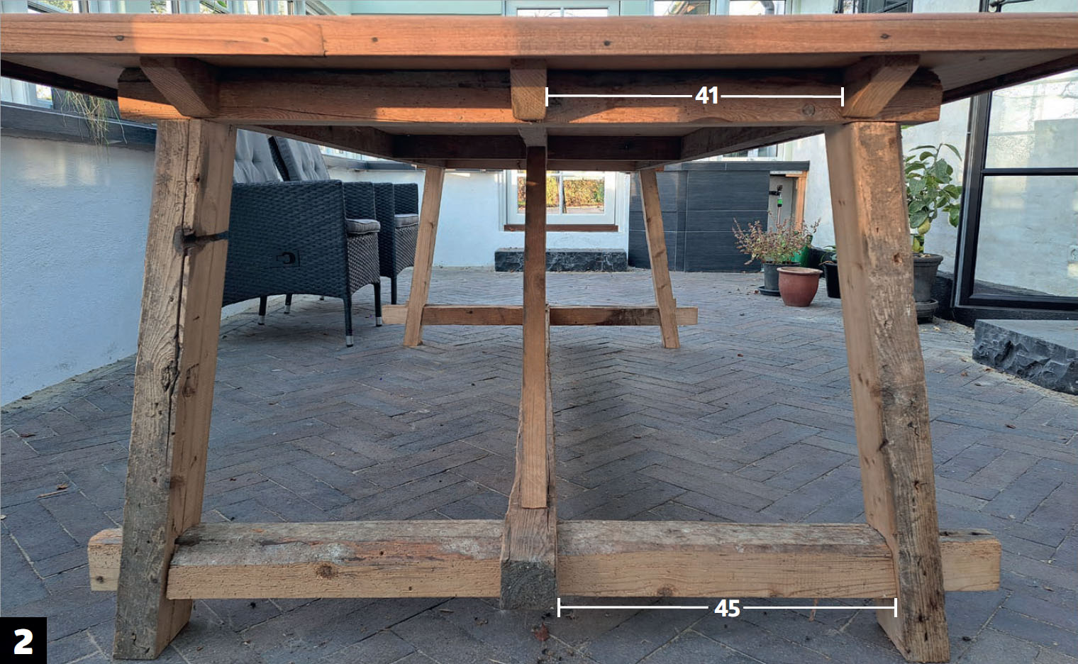 Det ger ett rustikt utseende som passar bra ihop med den långa bordsskivan i orangeriet där detta bord ska stå. Underredet mäter 126 x 384 cm och är 72 cm högt.