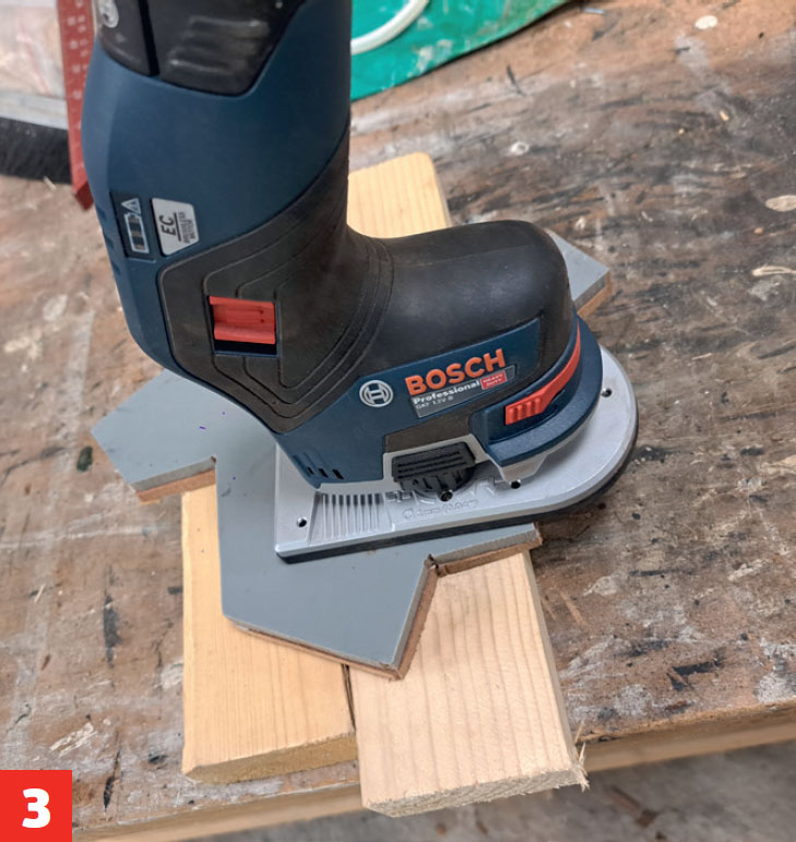 Kantfräsen kör runt kanten efter mallen som ligger ovanpå den utsågade skivbiten. Med en mall ser du till att alla figurer blir likadana.