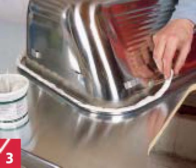 Sanitetskittet rullas till en cirka 1 m tjock sträng och läggs på undersidan av den breda kanten runt disklådan. Det är bättre att slösa i stället för att snåla med kittet.