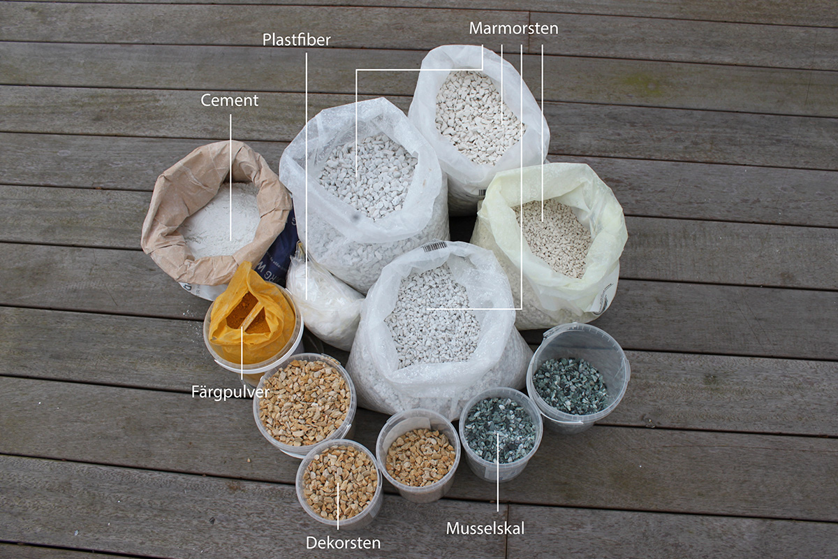 Större stenar och skal läggs ut i gjutformen innan gjutmassan hälls ner i formen. De här stenarna och skalen syns extra tydligt när skivan vänds så att undersidan nu blir den synliga ovansidan sedan.