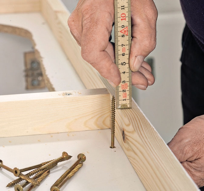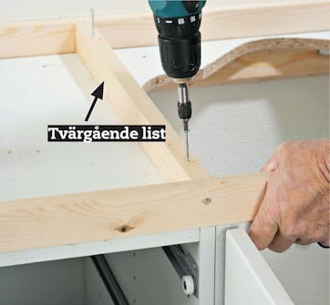 Ramen fästs på underskåpen med skruvar genom de tvärgående listerna och ett par längs fram- och bakkant. Här används 4,5 x 70 mm skruvar.