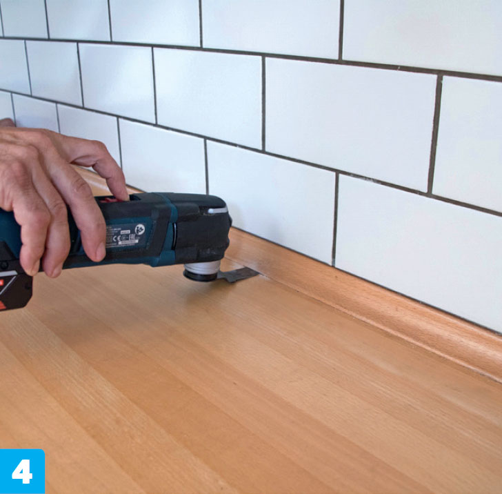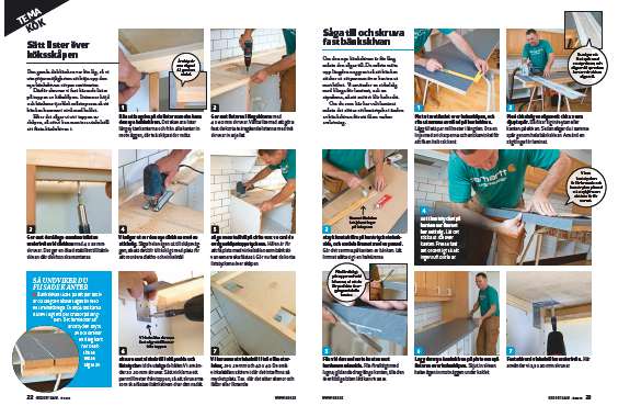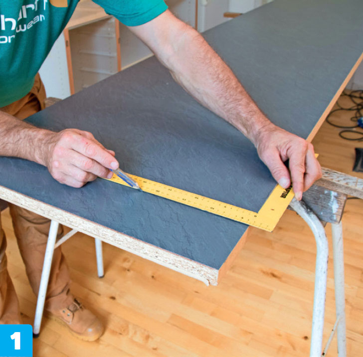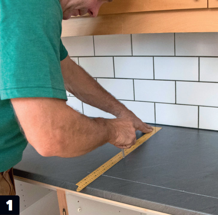 Mät ut avståndet över köksskåpen, och rita ut samma avstånd på bänkskivan. Lägg till ett par millimeter i längden. Dra en linje med snickarpenna och snickarvinkel för att få en helt rak kant.
