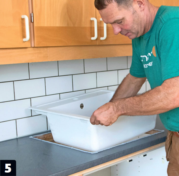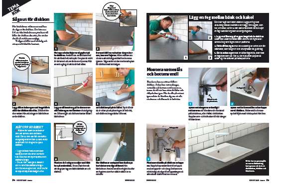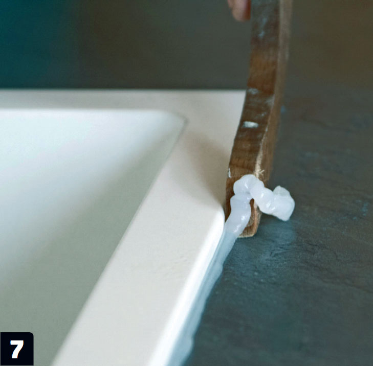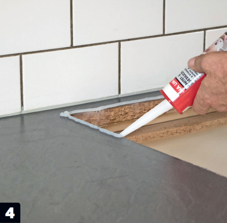 Lägg en silikonsträng på bänkens ovansida hela vägen runt kanten vid utsågningen. Silikonet gör att diskhons kanter fäster i bänkskivan.