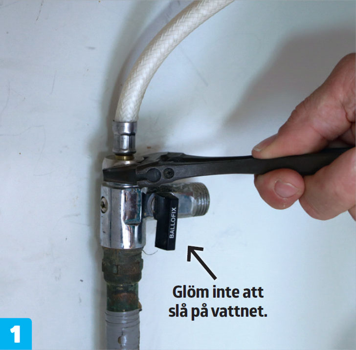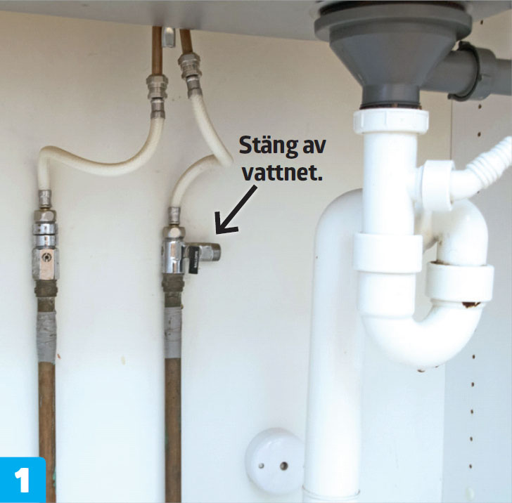 Vrid på ballofixkranarna så att vattnet stängs av. Sedan skruvas slangarna och avloppsrören av. Töm avloppsröret i en balja, och sätt tejp över röröppningarna så att det inte kommer in skräp under arbetet.