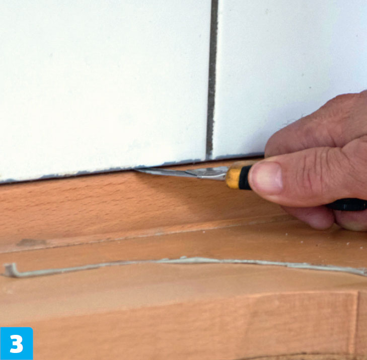 Skär loss fogen mellan kakel och list med en hobbykniv. Listen måste bort så att vi kan ta loss bänkskivan. Då den nya bänkskivan höjs upp behöver vi inte montera tillbaka listen igen.