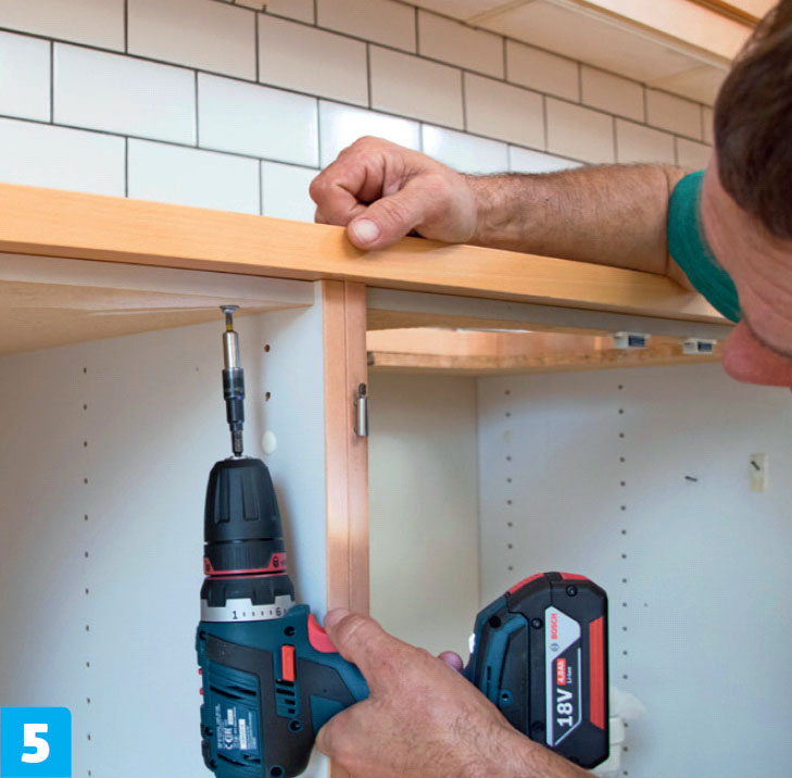 Därför skruvar vi fast bärande lister på toppen av kökskåpen. Listernas höjd och bänkens tjocklek måste passa så att bänken hamnar i nivå med kaklet.