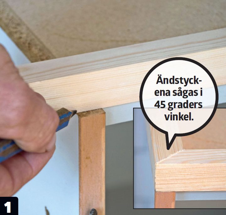 Såga även två hål på cirka 10 x 10 cm i de övriga skåpstoppstyckena. Hålen är för att få plats med vinkelstålen som bänkskivan senare ska fästas i. Gör nu fast de korta liststyckena över skåpen.