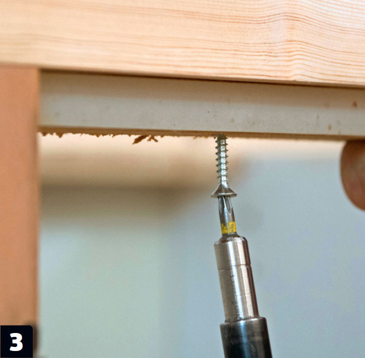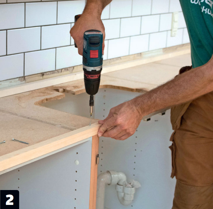 Gör fast den långa framkantslisten underifrån vid diskhon med 4 x 35 mm skruvar. Det ger en ökad stabilitet till bänkskivan där diskhon ska monteras.