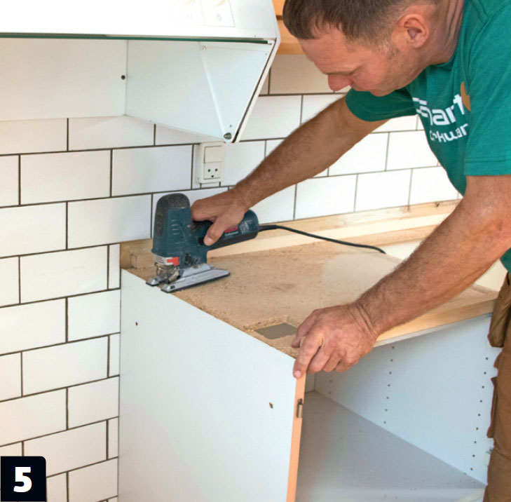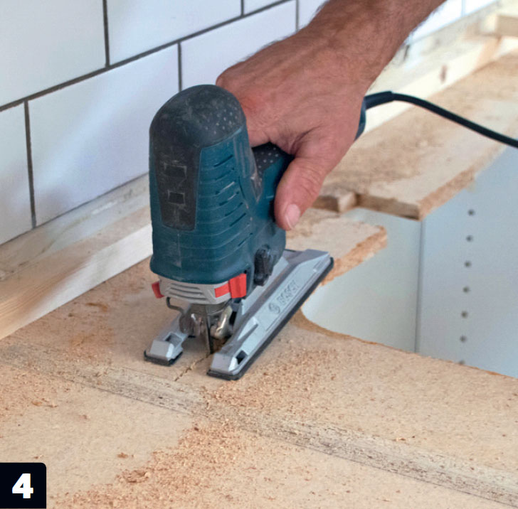 Vi sågar ut för den nya diskhon med en sticksåg. Såga hela vägen ut till skåpsväggen, så att det blir tillräckligt med plats för att montera diskho och vinkelstål.