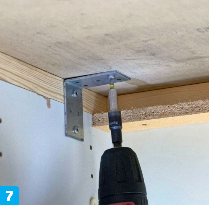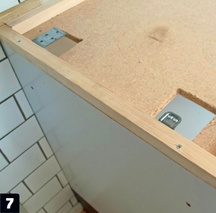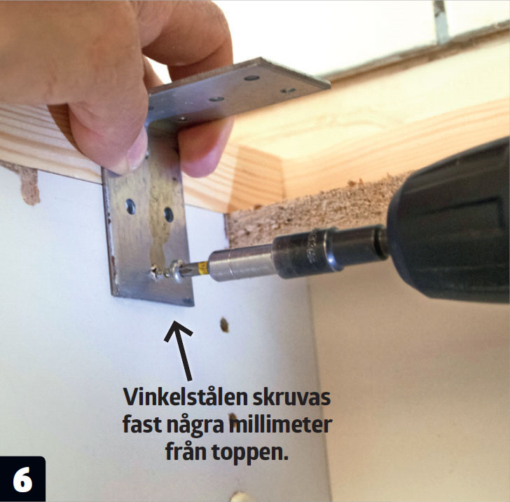 Skruva fast vinkelstål i skåpssida och liststycke vid de utsågade hålen. Vi använder 3 x 20 mm skruvar. Sätt vinklarna ett par millimeter från toppen, så att skruvarna som ska fästas i bänkskivan drar den nedåt.