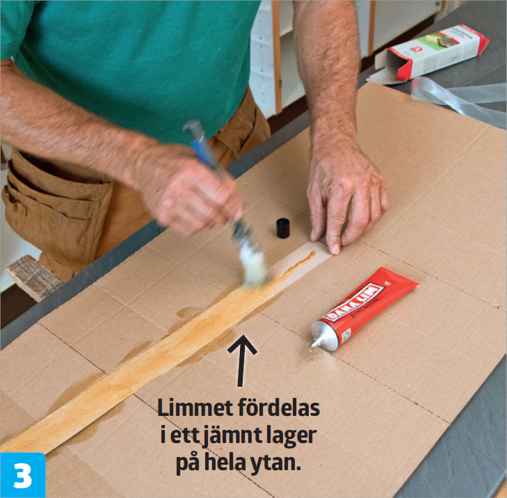 Stryk kontaktlim på kantstyckets baksida, och fördela limmet med en pensel. Gör det samma på kanten av bänken. Låt limmet sätta sig i en halvtimma.