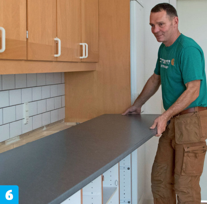 Lägg den nya bänkskivan på plats ovanpå listerna över köksskåpen. Skjut in skivan hela vägen in mot väggen under kaklet.