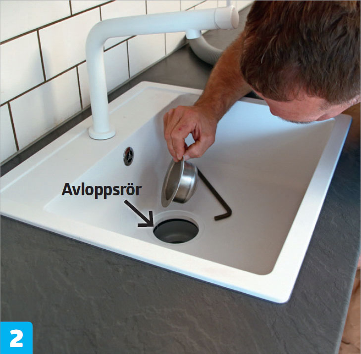 Spänn fast bottenventilen och avloppsröret i diskhon. Både ventil och insexnyckel följde med i detta paket från Ikea.
