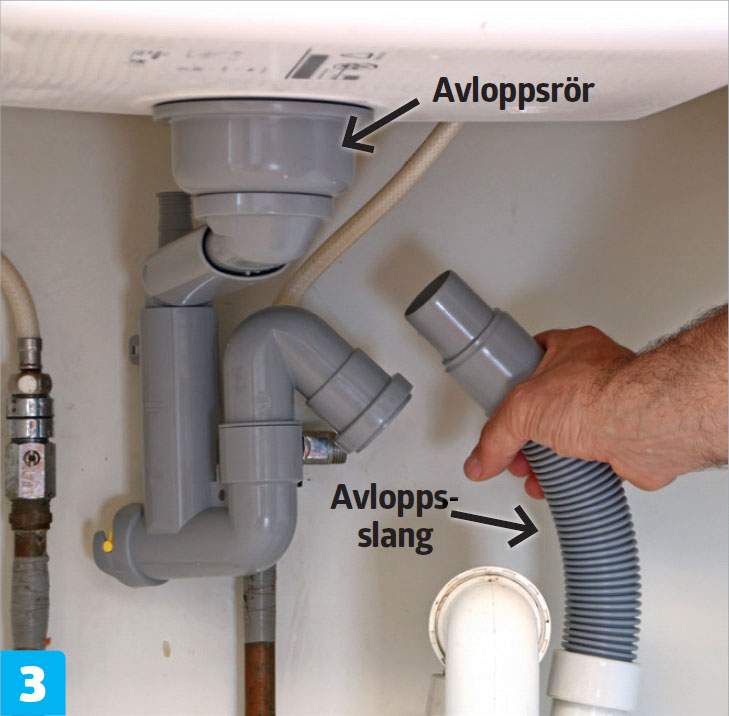 Montera vattenlås på diskhons avloppsrör. Koppla ihop vattenlåset till avloppet med avloppsrör- och slang. Det kan vara nödvändigt att såga till avloppsslangen så att vattnet obehindrat kan rinna ut.