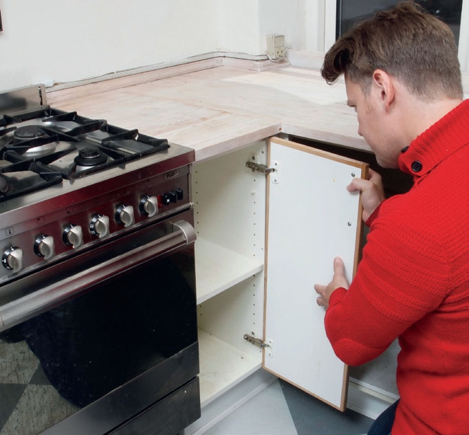 Börja med att ta bort alla hyllor i skåpen under köksbänken. Vi föreslår att du dessutom tar bort dörrarna, för de sitter säkert också i vägen. Märk varje skåpdörr så att du vet var den ska sitta.