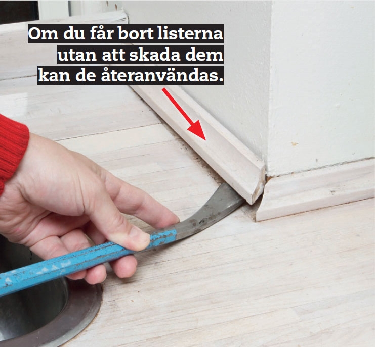 Bryt loss smyglisterna med kofot eller kasserat stämjärn. Men först skär du med vass hobbykniv längs ovankanten på listerna, så att du inte drar med dig tapeten när listerna tas bort.