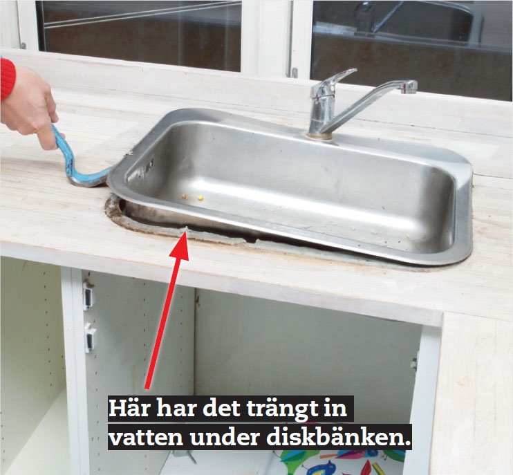 Lägg en sträng sanitetskitt på undersidan av kanten runt diskbänken. Om det redan sitter tätningslister längs kanten är det onödigt att täta ytterligare.