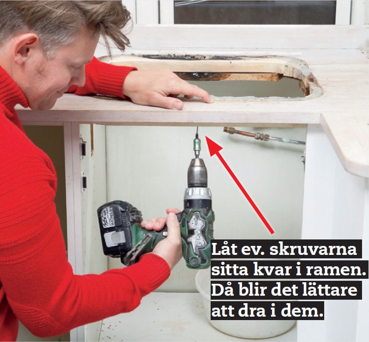 Lossa alla skruvar som håller fast köksbänken. Kika noga efter i skåpen för köksbänken kan sitta fast med beslag och skruvar som har dragits in genom toppskivan på skåpen.