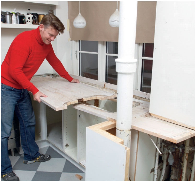 Innan du skruvar loss den gamla köksbänken är det ett par saker du bör göra. Ta bort alla skåpdörrar och hyllor, så att du får plats att arbeta i de trånga underskåpen. Se dessutom till att stänga av vattnet till kökskranen.