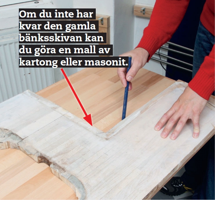 Lägg den gamla bänken på den nya skivan och rita av konturerna. Delar som ska sågas bort kan markeras med kryss, så att du inte av misstag kasserar fel. Då vet du också var du kan borra hål för att få ner sticksågsbladet när du ska såga upp hål för diskbänken. Använd sticksåg i kurvor och cirkelsåg på raksträckor.