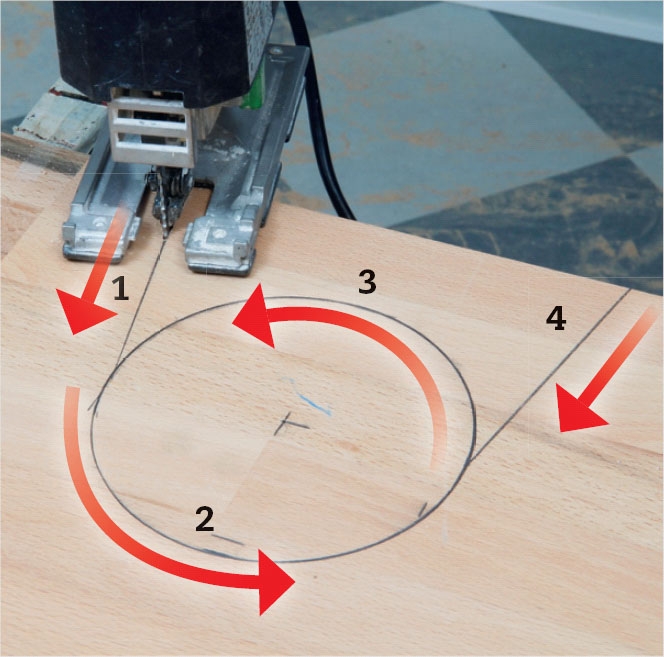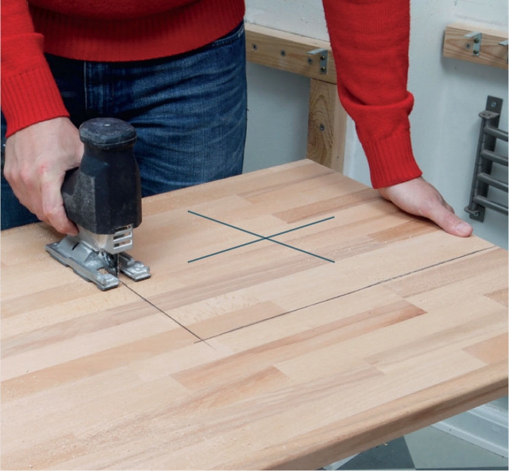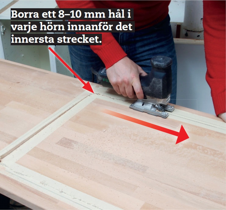 Såga med sticksåg i strecken. Om du tycker att kanterna trasas sönder av sågbladet är det bättre att såga från undersidan. Det är svårt men öva på en spillbit. Ska skivan kapas används cirkelsåg.