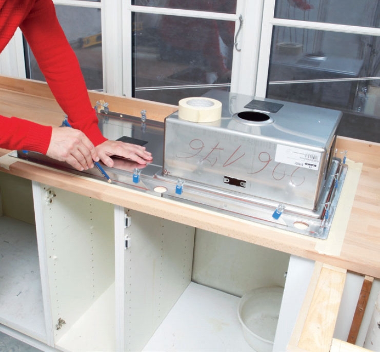 Lägg den nya bänkskivan på underskåpen och bestäm var diskbänken ska placeras. Fäst bred maskeringstejp på skivan under diskbänkens kant och rita hela vägen runt diskbänken på tejpen.