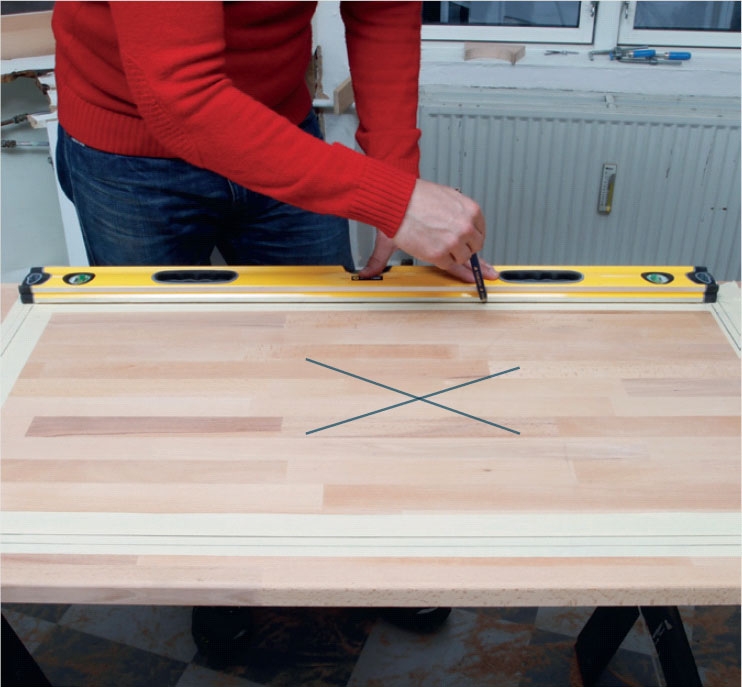 Lägg bänkskivan på ett par bockar och dra ett nytt streck cirka 1 cm innanför ditt streck - hela vägen runt. Kontrollmät falsen runt diskbänken, för minst hälften av den ska vila på bänkskivan när du har sågat ut för den.