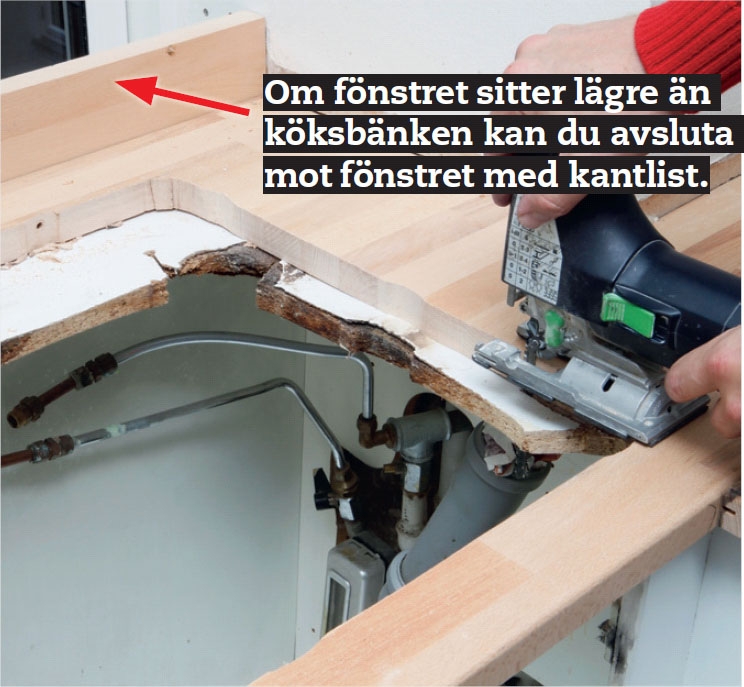 Om du har en köksbänk som denna med många vinklar, urtag, rör och andra hinder, så gäller det att hålla tungan rätt i munnen när du sågar ut delarna till din nya köksbänk.