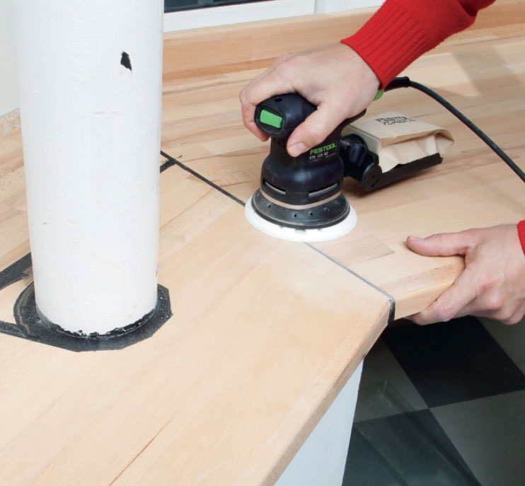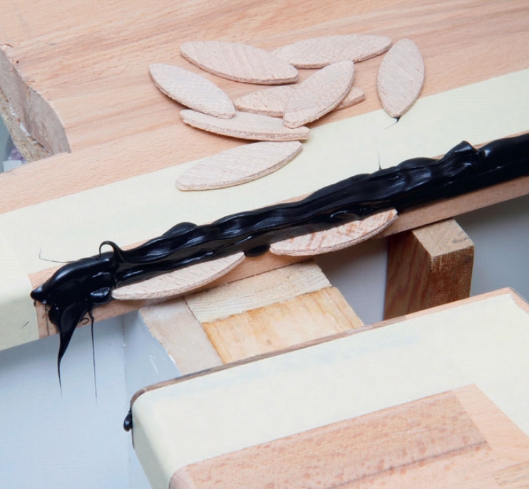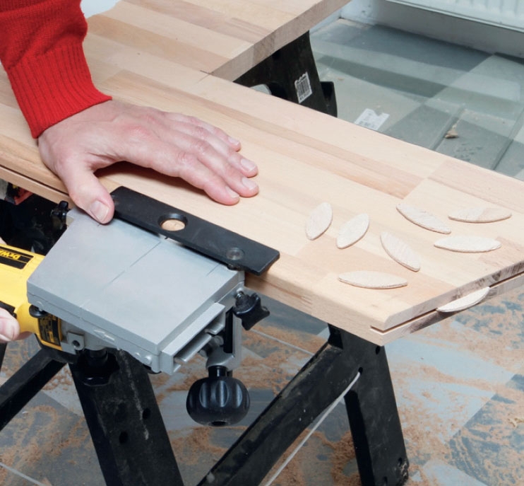 De olika skivdelarna skarvas ihop med lameller (kex), som sticks in i spår (noter), som du har fräst i skivkanterna. Delarna hålls sedan ihop med lamellerna, fogmassa och en list, som skruvas fast över skarven på undersidan.