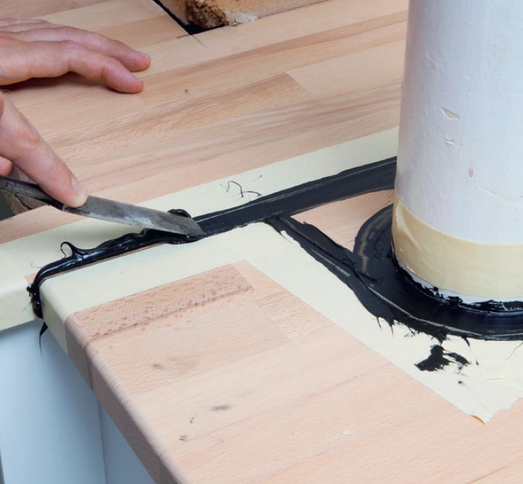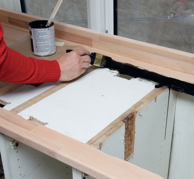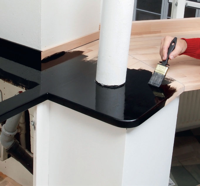 Den svarta oljelacken läggs på flödigt med mjuk pensel eller lackrulle. Var extra noggrann längs kanterna, där du har sågat hål för diskbänken.