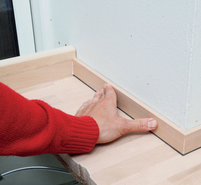 Pressa listen mot både väggen och köksbänken på en gång. Det är inte nödvändigt att skruva eller spika om du använder monteringslim. Å andra sidan blir det svårt att ta bort listerna.