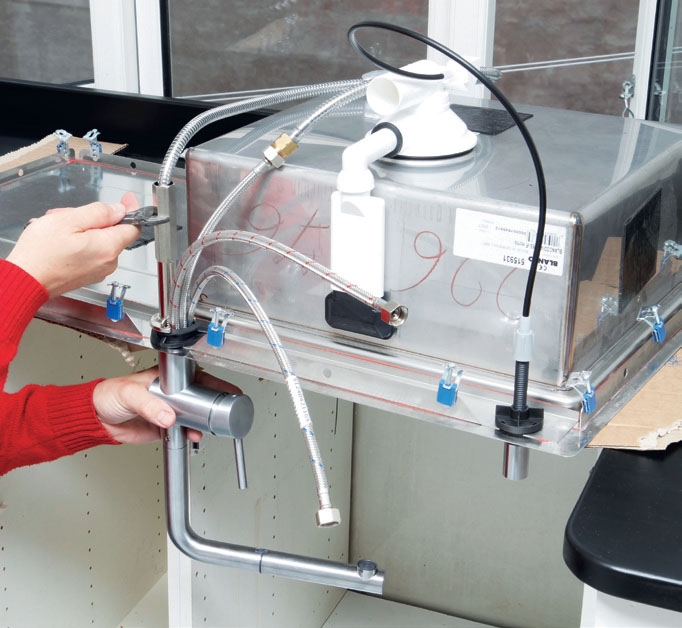 När du har satt diskbänken på plats, monterat kran och avlopp och anslutit vattnet, kontrollerar du att allt är tätt. Sätt sedan tillbaka hyllorna och montera dörrarna på underskåpen.