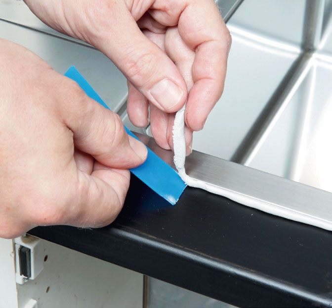 Innan du fogar med fogmassa ska du fästa maskeringstejp längs kanterna, så att du inte kladdar ner bänkskivan med fogmassan.