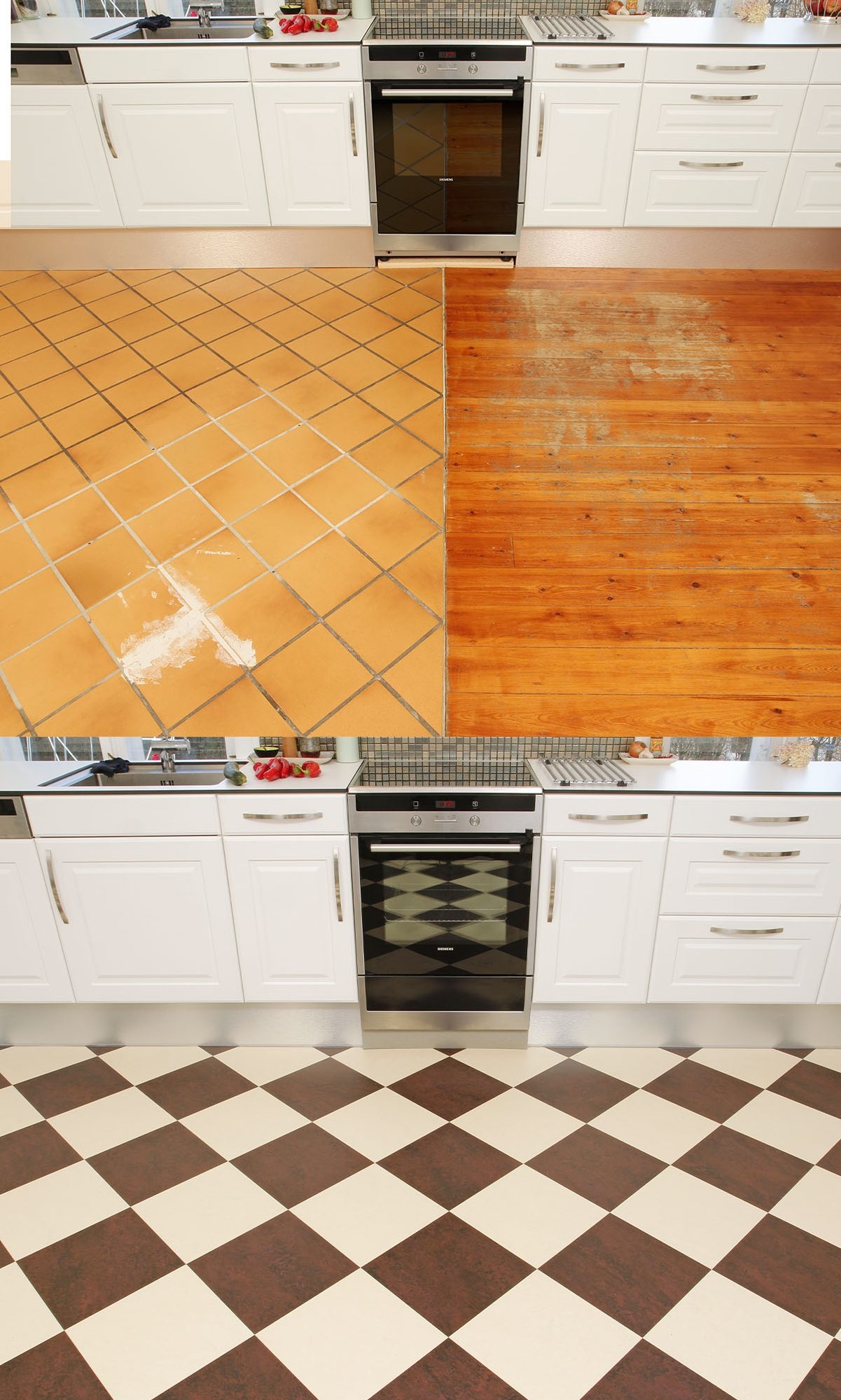 Om du lägger golv i ett kök bör du också ta bort socklarna under bänkskåpen - om det är möjligt. När de nya golvet har lagts kapas socklarna och sätts tillbaka på sina platser.