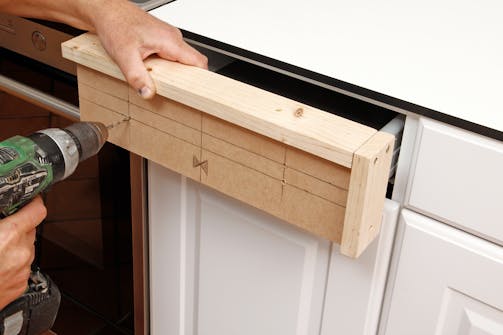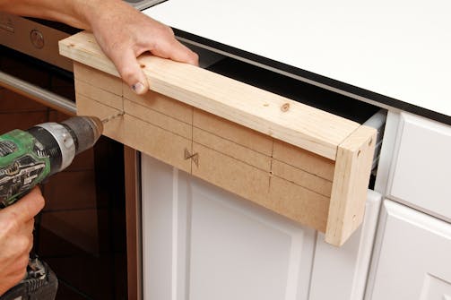 Mallen anpassas efter lådor med olika bredd. Man börjar med den bredaste och tar bort ändstycket, och kortar ner mallen så den passar de mindre fronterna.