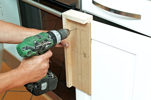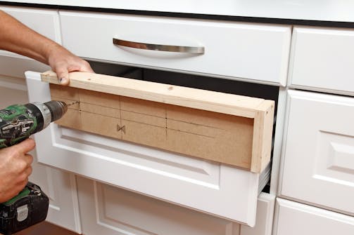 3. Vid lådor med profiler och ramar ska handtaget placeras så det harmonierar bra. Man använder samma mall som innan, men borrar nya hål – närmre den övre kanten.