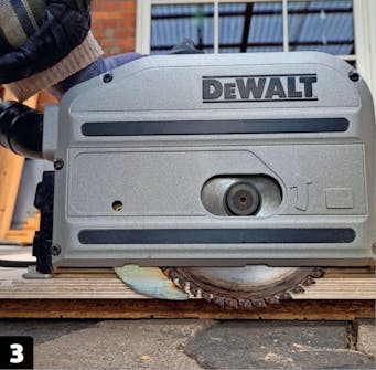 Innan vi sågar ser vi till att slangar och kablar är på rätt sida om skenan så att de inte drar skenan ur läge. Placera sågen på skenan och såga igenom med ett långt och jämnt snitt.