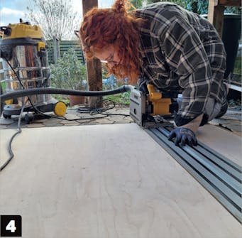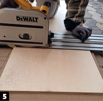 Vi använder en sänksåg för arbetet och växlar mellan en 1,5 m skena och en 3 m skena så att alla snitt kan göras i en lång rörelse. Detta ger de snyggaste kanterna.