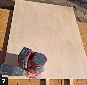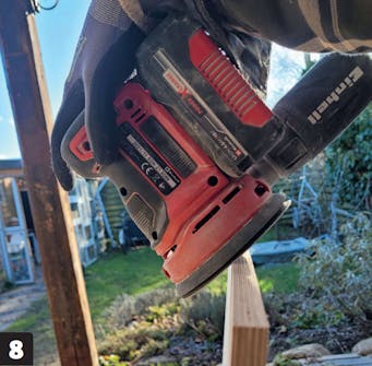 Fronterna ska slipas. En excenterslip är idealisk eftersom den inte lämnar ett tydligt mönster i träet. Börja med slippapper K120. Detta är ofta tillräckligt men om det behövs, följ upp med K180.